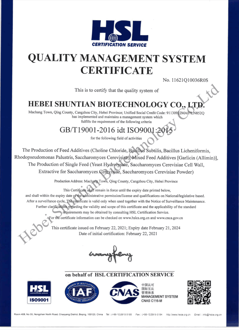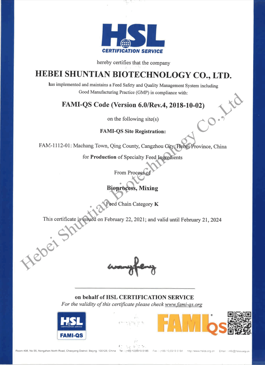 Tianjin Anqirui Technology Co.,Ltd . es una empresa de alta tecnología especializada en investigación, desarrollo, producción, venta y servicios técnicos de aditivos para piensos. Es vicepresidenta de la Asociación de la Industria de Piensos de Cangzhou, una de las principales empresas de la provincia de Hebei. La empresa está ubicada en la ciudad de Cangzhou, provincia de Hebei, con fácil acceso a Pekín y al puerto de Tianjin. Cuenta con equipos de producción de vanguardia, un taller de fermentación microbiana, una base experimental estándar, un riguroso equipo de investigación científica y un sistema de gestión de calidad que garantiza la producción de productos de alta tecnología.